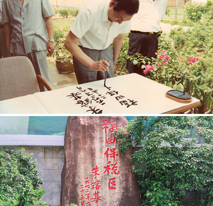 深圳是国内最早开始探索保税政策的城市,福田保税区则是深圳最早建成并投入使用的保税区。原国务院总理朱镕基分别于1992年和1997年两次莅临福田保税区考察,一向主张只签名不题词的朱镕基总理原本并不打算为保税区题词,但在在他签写自己的名字后,一旁的观众掌声雷动,经久不息,总理着实是性情中人,为此破例下笔题写了“福田保税区”五个大字。当时总理乐呵呵地开玩笑道:“这个字的版权是我的,很值钱的。”当时在观众席中的乐鱼老员工每次向别人解释总理题词原稿中名字在右,而“福田保税区”在左的原因时,总是带着骄傲的语气。总理体“福田保税区”至今沿用于保税区内各标志性景观。
