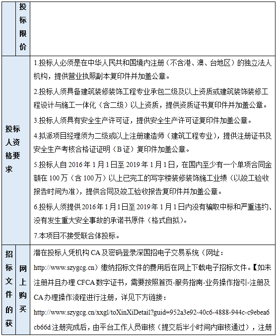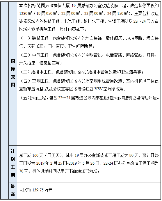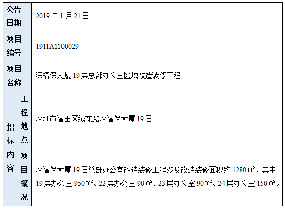乐鱼大厦19层总部办公室区域改造装修工程(项目名称)招标方(招标人)为深圳市乐鱼(集团)有限公司(招标人单位名称),采购资金来自企业自筹(资金来源),项目出资比例为100%。项目已具备招标条件,现进行国内公开招标。