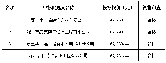 长宝大厦宿舍区ABC段进户木门更换工程(招标编号:SFBWY/ZB(WX)-2019-011),于2019年11月6日在集团内外网发布招标公告,招标控制价17.6万元,评标办法为经评审的最低投标价法。投标截止日期2019年11月13日上午9时前,有效投标人4家,现将中标人公布如下: