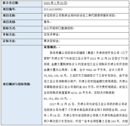 浚信投资公司购房合同纠纷诉讼二审代理律师服务项目(项目名称)招标人为深圳市乐鱼(集团)有限公司(招标人单位名称),采购资金来自企业自筹(资金来源),项目出资比例为100%。项目已具备招标条件,现进行国内公开招标。
