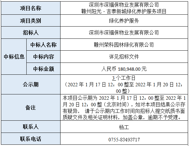 深圳市乐鱼物业发展有限公司赣州阳光·吉泰新城绿化养护服务项目已完成评审,现将本项目评审的相关情况及结果进行公示,具体内容如下: