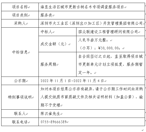 在深圳市建设工程材料设备询价采购平台进行公开招标的海昱生活区城市更新古树名木专项调查服务(项目编号:SZXJCG-S202209290001)已完成评审及定标,现将本项目评审的相关情况及中标结果进行公示,具体内容如下: