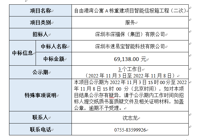 自由港湾公寓A栋重建项目智能信报箱工程(二次)已完成评审,现将本项目评审的相关情况及结果进行公示,具体内容如下: