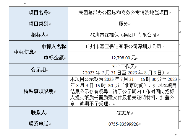 集团总部办公区域和商务公寓清洗地毯项目已完成评审,现将本项目评审的相关情况及结果进行公示,具体内容如下: