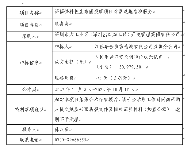 在深圳市建设工程材料设备询价采购平台进行公开招标的乐鱼科技生态园提容项目防雷设施检测服务(项目编号:SZXJCG-S202309110002)已完成评审及定标,现将本项目评审的相关情况及中标结果进行公示,具体内容如下:
