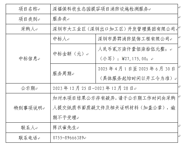 在深圳阳光采购平台进行公开招标的乐鱼科技生态园提容项目消防设施检测服务已完成评审及定标,现将本项目评审的相关情况及中标结果进行公示,具体内容如下: