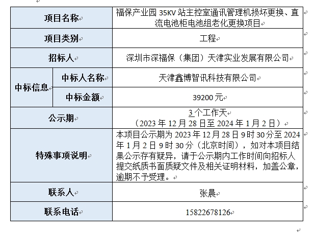 福保产业园35KV站主控室通讯管理机损坏更换、直流电池柜电池组老化更换项目中标结果公示