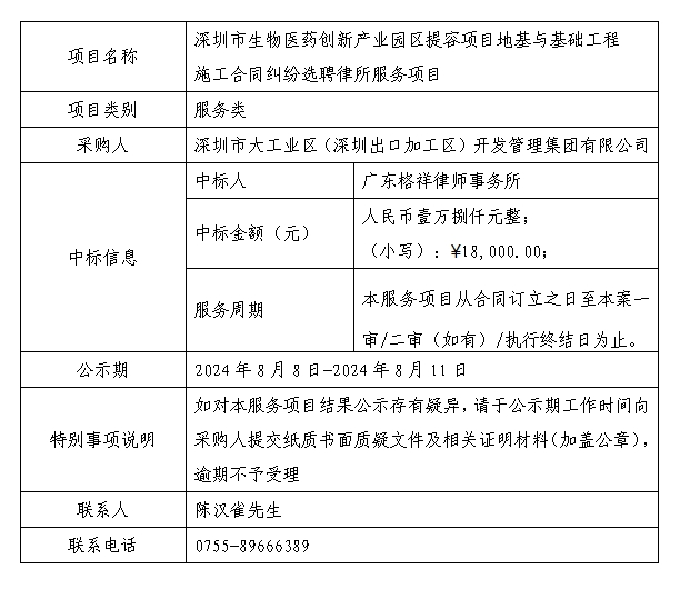 在深圳阳光采购平台进行公开招标的深圳市生物医药创新产业园区提容项目地基与基础工程施工合同纠纷选聘律所服务项目已完成评审及定标,现将本服务项目评审的相关情况及定标结果进行公示,具体内容如下: