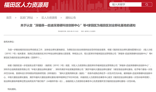 8月16日,根据《福田区创业孵化基地管理办法》(福人力规【2019】1号)规定,福田区人力资源局完成福田区2023年创业孵化基地认定受理、审核及公示,深圳市福保园区运营有限公司运营的乐鱼-启迪深港硬科技创新中心荣列其中,被认定为“福田区创业孵化基地”。