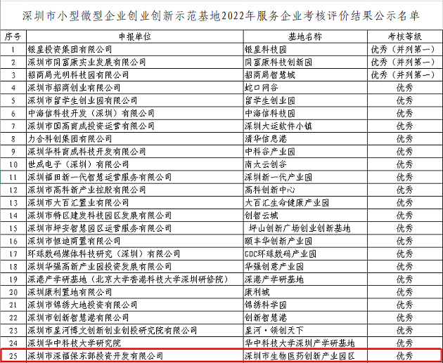 生物园获评深圳市小型微型企业创业创新示范基地2022年服务企业考核“优秀”等级